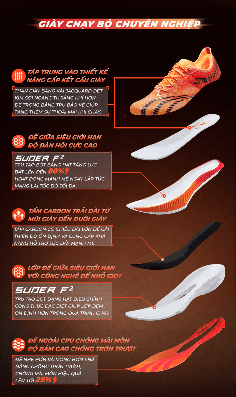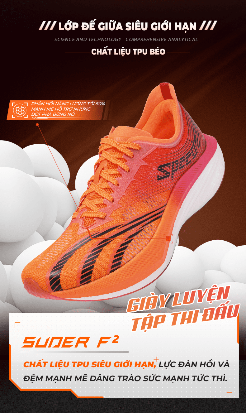 • Đế giữa siêu giới hạn SUDER F² giúp độ đàn hồi ≥80%, khả năng bật mạng mẽ ngay lập tức mang lại tốc độ tối đa.