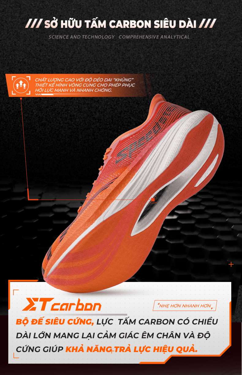 • Đế giày với công nghệ FULL CARBON có chiều dài lớn trải từ mũi đến đuôi giày giúp cải thiện độ ổn định và cung cấp khả năng hỗ trợ lực đẩy, trả lực mạnh mẽ.